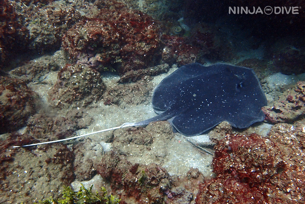 水中はモワモワっと白濁気味ですが、それはそれで雰囲気があって面白いです。広大な砂州と珊瑚が混在していて普段あまり見かけない数種類のエイに遭遇できました。写真の尾の白いエイはマングローブエイです。