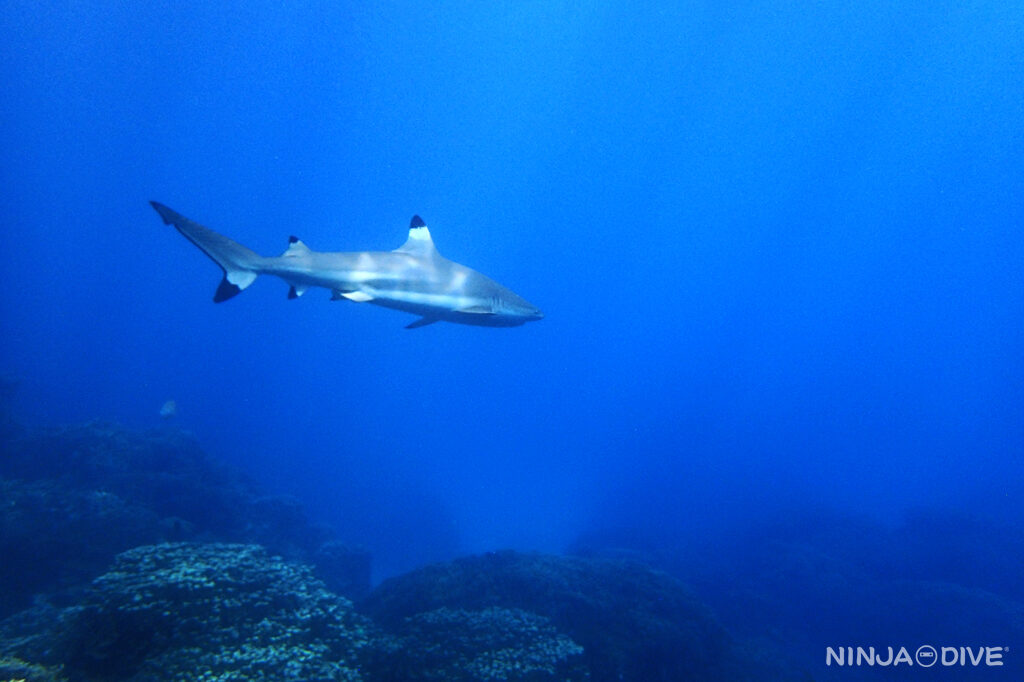 ボムホールは朝イチに行くとブラックチップシャークがお出迎えしてくれます。今回は4匹ほど会えました!お連れしたダイバーさんも初めてみるサメに大興奮!ここのサメはボートダイビングで見るサメより、距離が近いので見応えがありますよ。