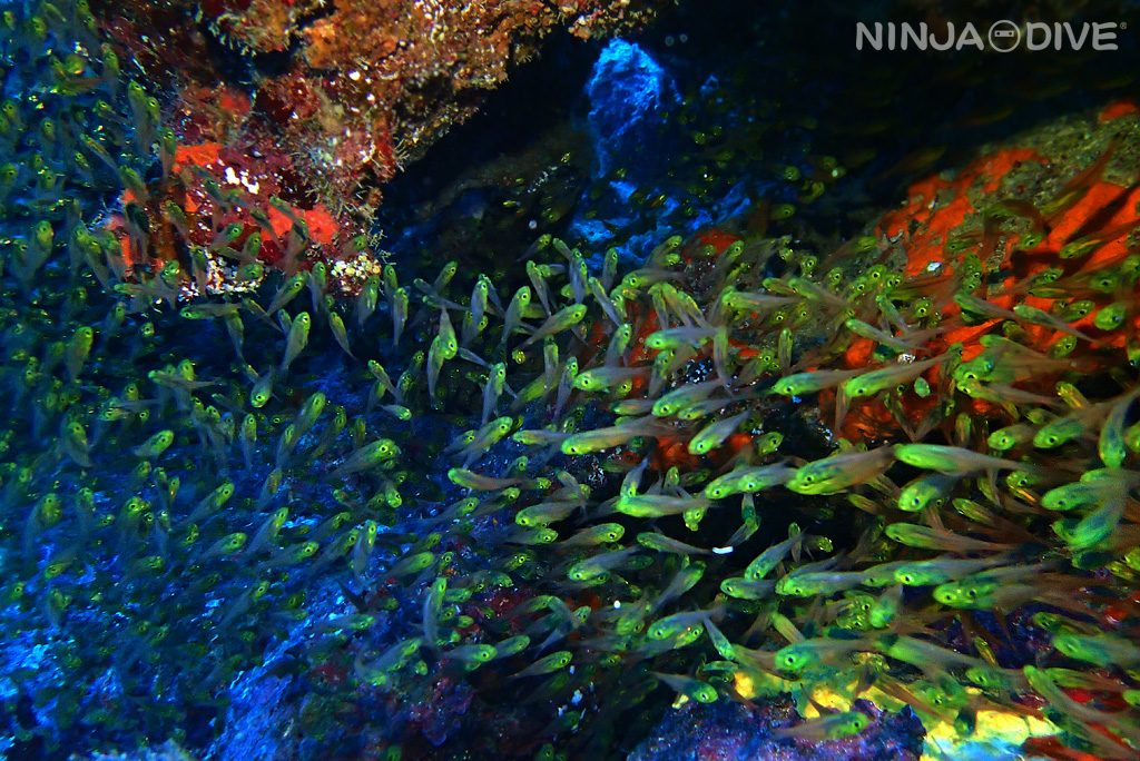 投稿しそびれていた先月のファンダイビング時に遭遇したイエローカーディナルフィッシュ(ミクロネシアの固有種)のおびただしい数の群れです。岩穴でグルグルと渦を巻くファンタジックな光景にハッと息をのみました。このイエローカーディナルフィッシュはテンジクダイ科の魚で体長5cmととても小さく、1匹1匹を見ると儚げな印象ですが、今回のように無数ともいえる群れは「圧巻」で、なぜか小学校の国語の教科書に載っていたスイミーを思いだしてしまいました。