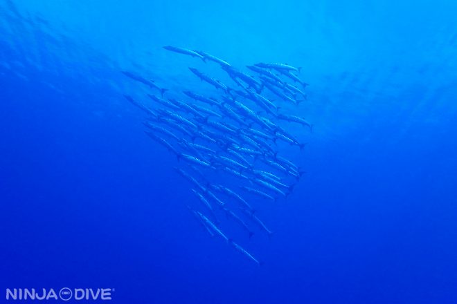 グアム北部のダイビングポイント「ナポレオンカット」で遭遇したバラクーダの小さな群 … Read More