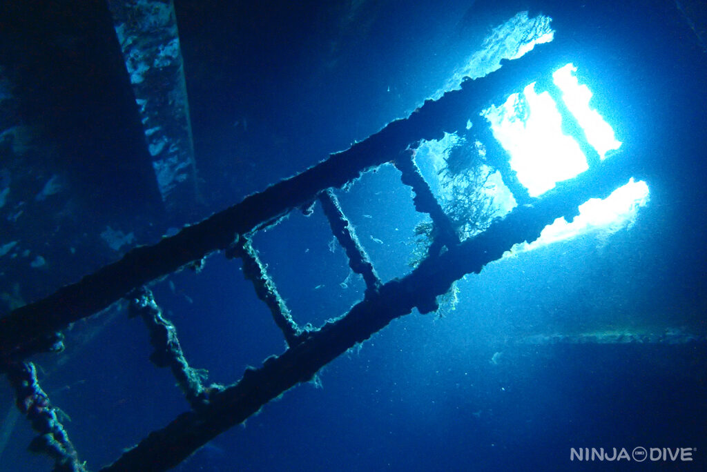 沈船アメリカンタンカーの小さめの入口から船室に入り、くまなく探検しました。沈船の梯子を見るとなぜかワクワク感が高まります!かつて、船員が登り降りでしたであろう感がワクワクさせるのでしょうか?!これぞ時空を越えたロマンでございます。
