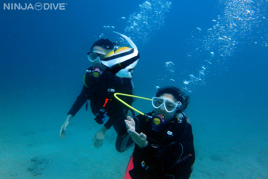 ライセンス講習初日。はじめて水中で呼吸をするときはおっかなびっくりの緊張感もありますが、慣れてくればこっちのもの。スキルの練習はけっして楽しいものばかりではありませんが、水中でたくさんの魚に囲まれるとテンションも上がり、不思議と余裕がでてきたりもします。スキルを1つ1つクリアして、それを自信に変えて2日間ガンバってください!