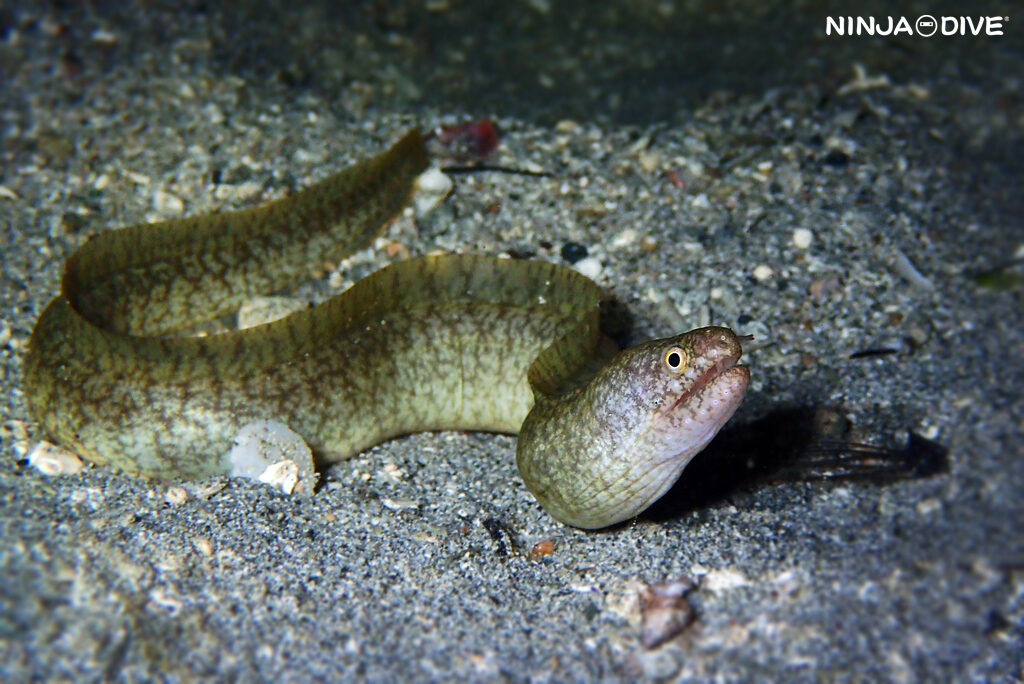 10cmくらいのウツボの幼魚。まだあどけない表情をしています。エキジット寸前の水深70cmの浅瀬で見ました。(ニョロニョロ系が苦手な方ごめんなさい)