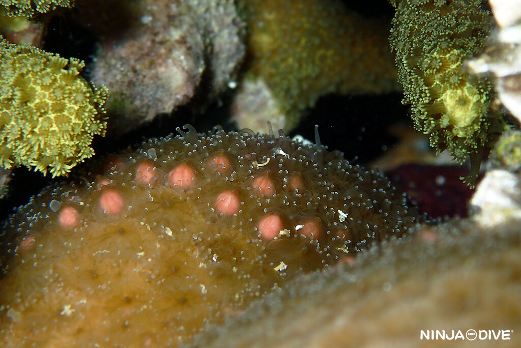 ヒラカメノコヒクメイシ(Goniastrea edwardsi)のバンドルセット。ほんの一部分のみの産卵でしたが、大粒のピンク玉がとっても可愛いかったです。