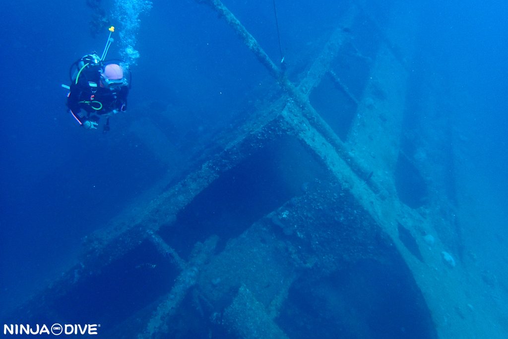 沈船づくしの日、3本目は第二次世界大戦で沈んだ日本の船「東海丸」です。元々は絹を運ぶ商業船だったようですが、アメリカ軍の潜水艦の魚雷攻撃をうけて海底に沈みました。全長130メートル以上ある沈船で、水深16メートルから30メートルに沈んでおり、レックダイビング愛好家に人気の高いダイビングポイントです。