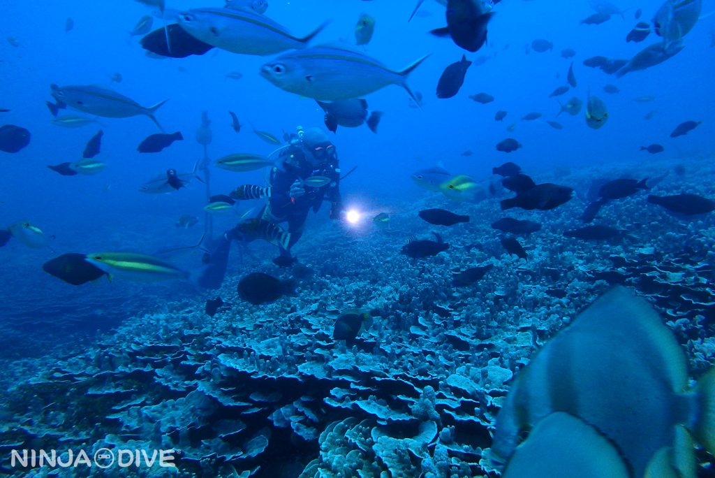 ギャブギャブ2をリクエストされたダイバーSさん。ひらひらと周囲を舞うナンヨウツバメウオの群れに驚いていました。ギャブギャブ2はナンヨウツバメウオだけではなくキツネウオ、タカサゴ、ダスキーアネモネフィッシュ、ハナビラクマノミ、アオウミガメなどがよく見られます。時にはオオテンジクザメも出現するので見るものに飽きないダイビングポイントです。