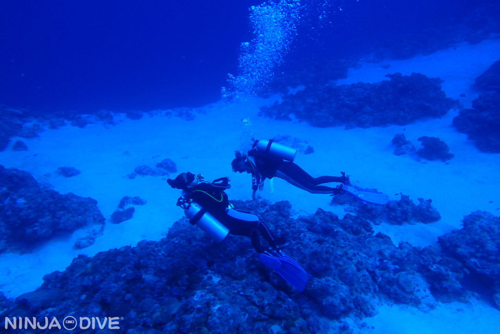 潜水 Diving ヒーリング 2016年7月8日 by NINJA DIVE ブルーアンドホワイトでファンダイビング!青い海と白い砂地のコントラストがとても美しいダイビングポイントです。仲良し女子がのんびる癒しダンビングする様子、この写真から伝わりますか?