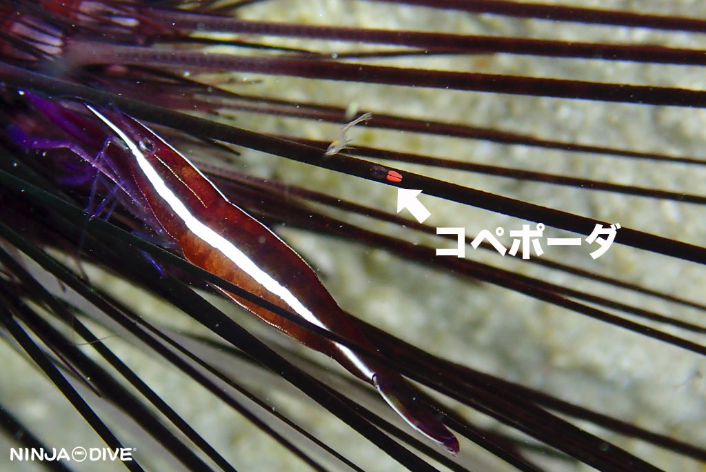 珊瑚の産卵狙いで連日ナイトダイビング!珊瑚に動きがないか待ってる間は、もっぱら水中生物の観察です。夜にしか現れない生物たちがいっぱい出没しますよ!写真はガンガゼ(ウニ)にくっついて擬態する「ガンガゼカクレエビ」= Tuleariocaris zanzibaricaです。パープルの足がキレーですね。よくよく見てみるとお腹に卵がいっぱい詰まってるのが分かります。