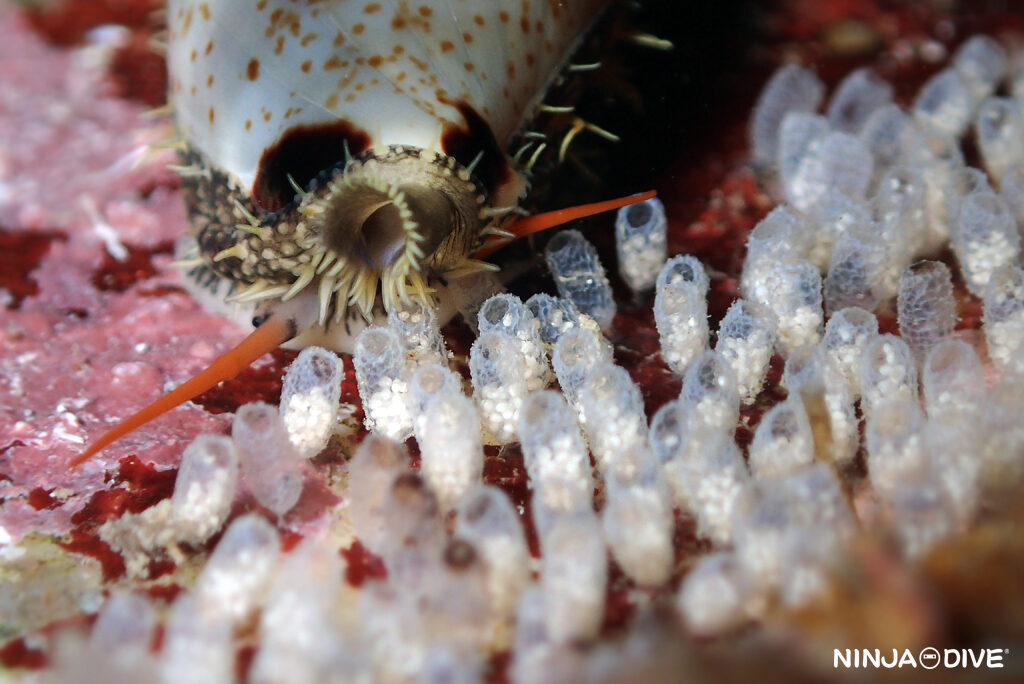 謎の貝の卵です。シャンパングラスのようなカプセルに、白いツブツブがたくさん詰まっていました。奥にいる「タカラガイ」の卵かどうかまでは分かりません。カプセルは意外と強度がありました。さぁてどんな子たちが生まれるのでしょう?