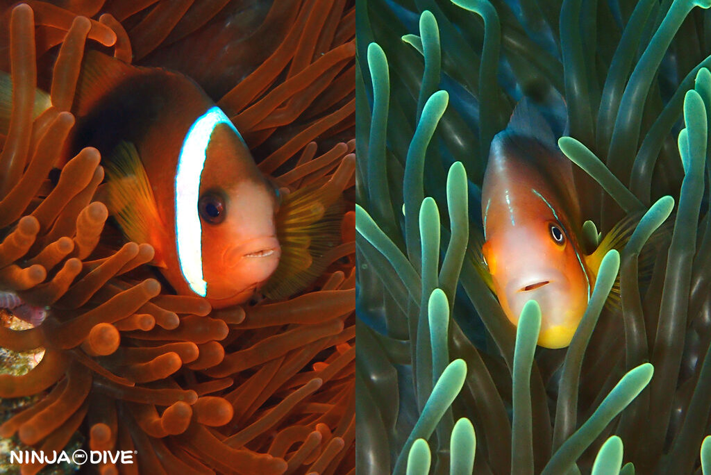 「ギャブギャブ2」のダスキーアネモネフィッシュ(ミクロネシア固有種のクマノミ)と真っ赤なシライトイソギンチャク、そしてハナビラクマノミとグリーンのシライトイソギンチャク。なんて美しいんだろう!と水中でうっとりでした。