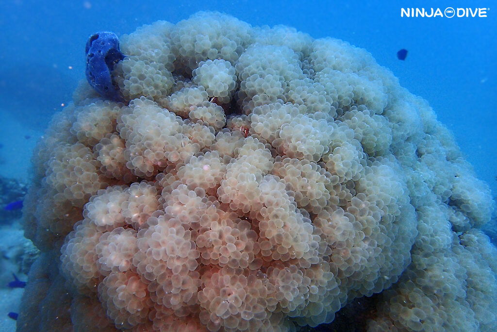 日本では奄美大島以南に生育なので南国のソフトコーラルです。記述によると直径20㎝以上の大型群体はほとんど見られない、となってますがグアムのこのバブルコーラルは100cmもありドデカいんです。もしや激レア!?このコーラルにはセクシーシュリンプ(和名:イソギンチャクモエビ)もいつもいますよ。