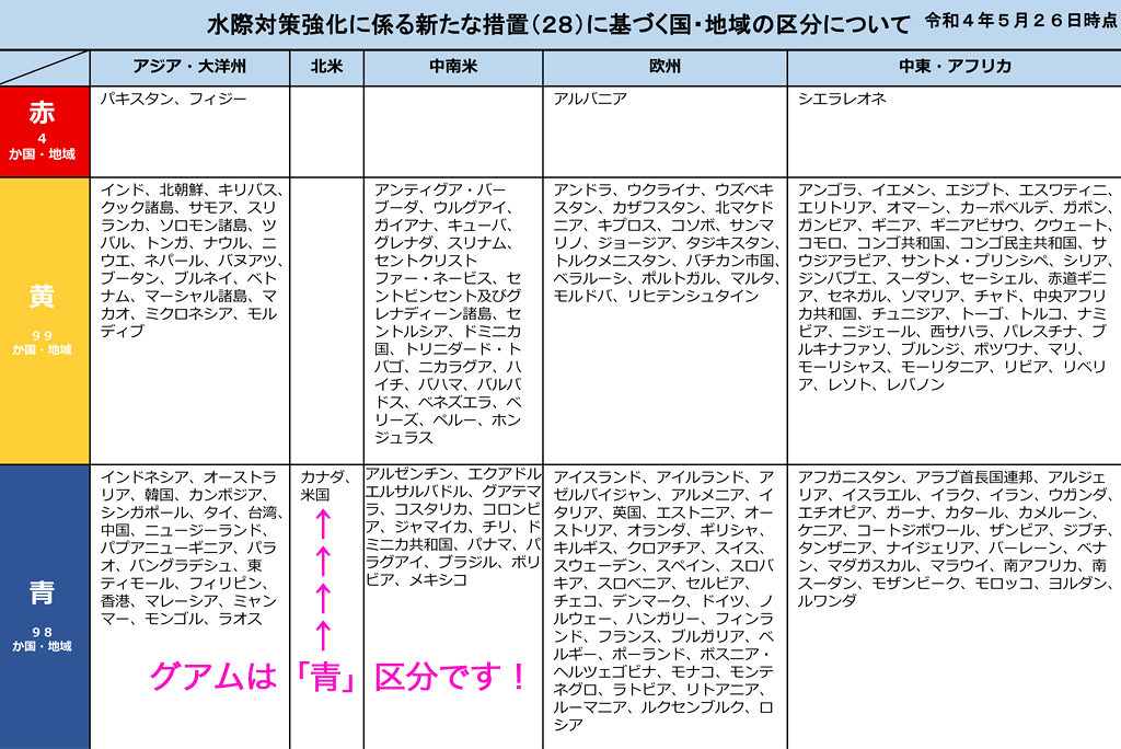 5/26付けで外務省から「国・地域の区分」の発表がありました。米国に含まれるグアムは「青」の区分です。きっとそうだろうなぁとは思ってましたが、確定してひと安心。よって、6/1(水)以降はグアムから日本に入国(帰国)する際、空港での検疫(検査)なし、待機期間(行動制限)なしになります。しかし…