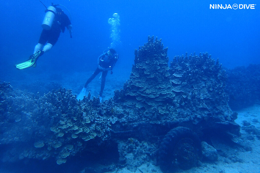 本日のボートファンダイビングはご夫婦でお見えのFさま。そしてダイビングポイントは、外洋「シャークスピット」と湾内「シービージャンクヤード」でした。両ポイントとも戦争のスクラップがたくさん落ちているポイントなので、人工物と自然の融合的な光景を目にすることができます。