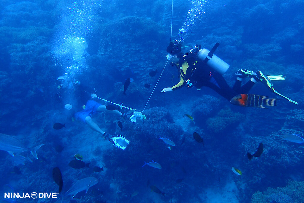 慣れてきたらロープを離していただいてOKですが、もちろんロープにつかまったままがいい方はそれでもOKです!NINJA DIVE は体験ダイバーに細かいことは言いません★ 安全に楽しく終われれば十分なのですから…✨