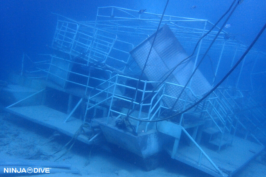 台風で見事に沈んでしまったシーウォーカーのプラットフォーム。今だけレックダイビング可能です、いえ嘘です!人工物をこうやって水中でみると不思議な気持ちになりますね。