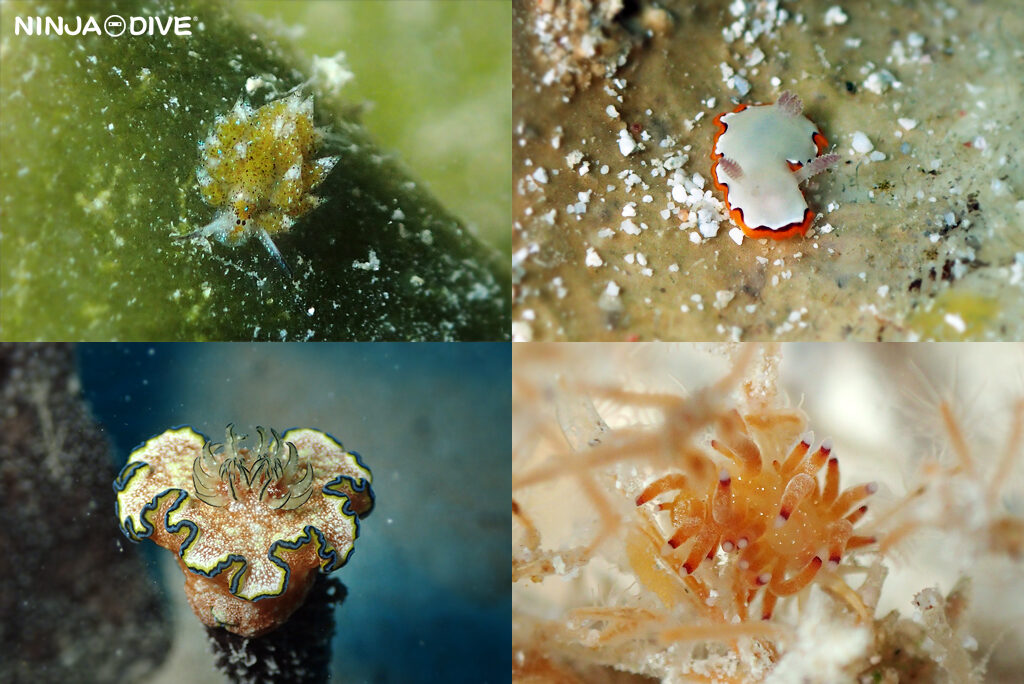 今回 出会えたウミウシの一部をご紹介!若草色が爽やかな「クサイロモウミウシ」、フチの波模様が可愛い「ウチナミシラヒメウミウシ」、定番の「モンジャウミウシ」、お花みたいな「シロタエミノウミウシ属の一種」です。