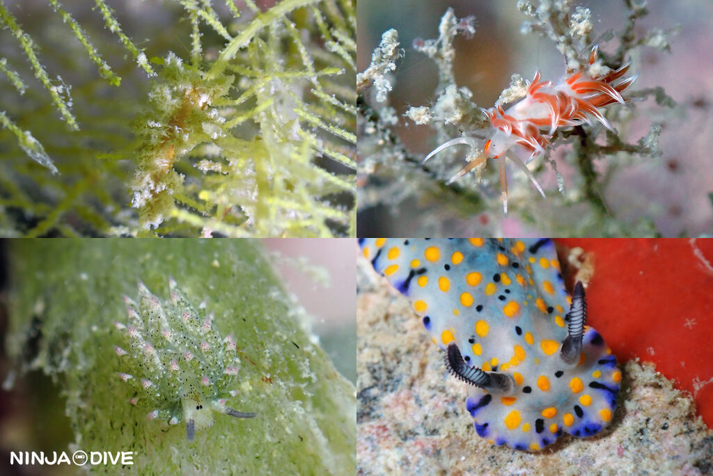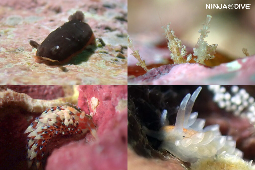 ⑤ホンクロシタナシウミウシ、⑥⑦Dotoの一種とマトミノウミウシ?、⑧ヒブサミノウミウシ、⑨フウセンミノウミウシ。この他に、写真うまく撮れなかったので載せていない…ランソンミノウミウシ、メモリーカード不良で残念ながら撮れなかった…ロータスミノウミウシにも会えました。