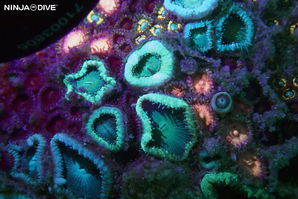 タイでも持っていったUVライトでイワスナギンチャクを照らしてみました。カラフルでテンションあがるあがる!イワスナギンチャクも珊瑚と一緒で蛍光物質で褐虫藻を集めてます。共生相手がいないと生きていけませんからね。