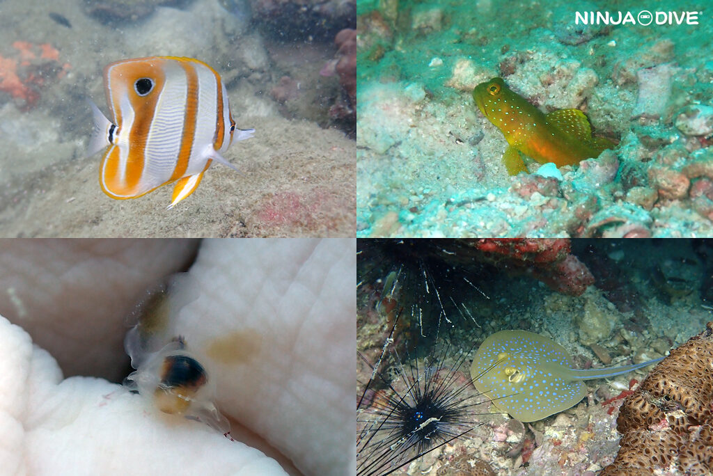 ①ハシナガチョウチョウウオ、②ギンガハゼ、③謎のパタパタ(てっきりウミコチョウかなとはしゃいでしまいましたが…😅)、④アオマダラエイ