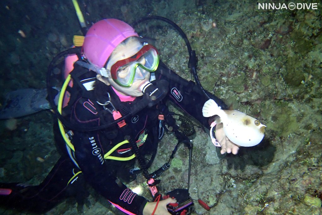 アガット港から出港、ハップスリーフでのナイトダイビング。真っ暗闇の中から突如グレーのエイがヒラヒラと飛び出してきたり、コクテンフグがビックリしてまんまるに膨らんだりと…ナイトダイビングは視界が限られている中での生物との一期一会がシゲキ的でやみつきになります。