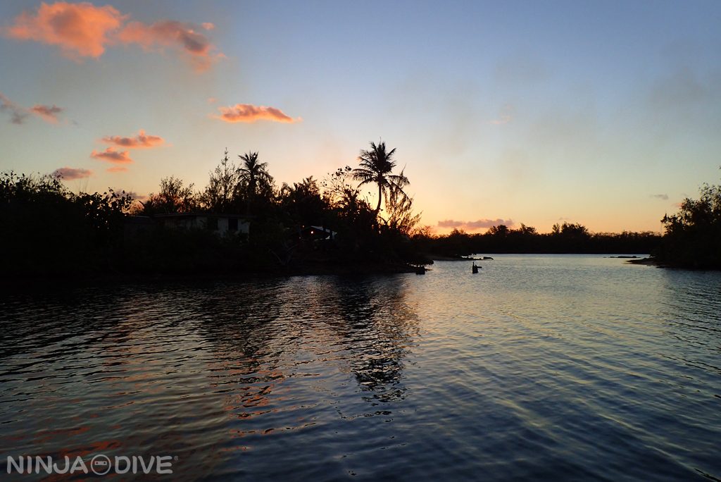 ボートで行くナイトダイビング、その出港直前の夕陽と木々のシルエットです。日中とはまったく雰囲気の違う、陽が沈みゆく中での準備はワクワクを加速させてくれます。ボートでの移動時間は15分ほど、エントリーの頃には真っ暗です。水中ライトの灯りを頼りに沈船アメリカンタンカーでのダイビングでした。